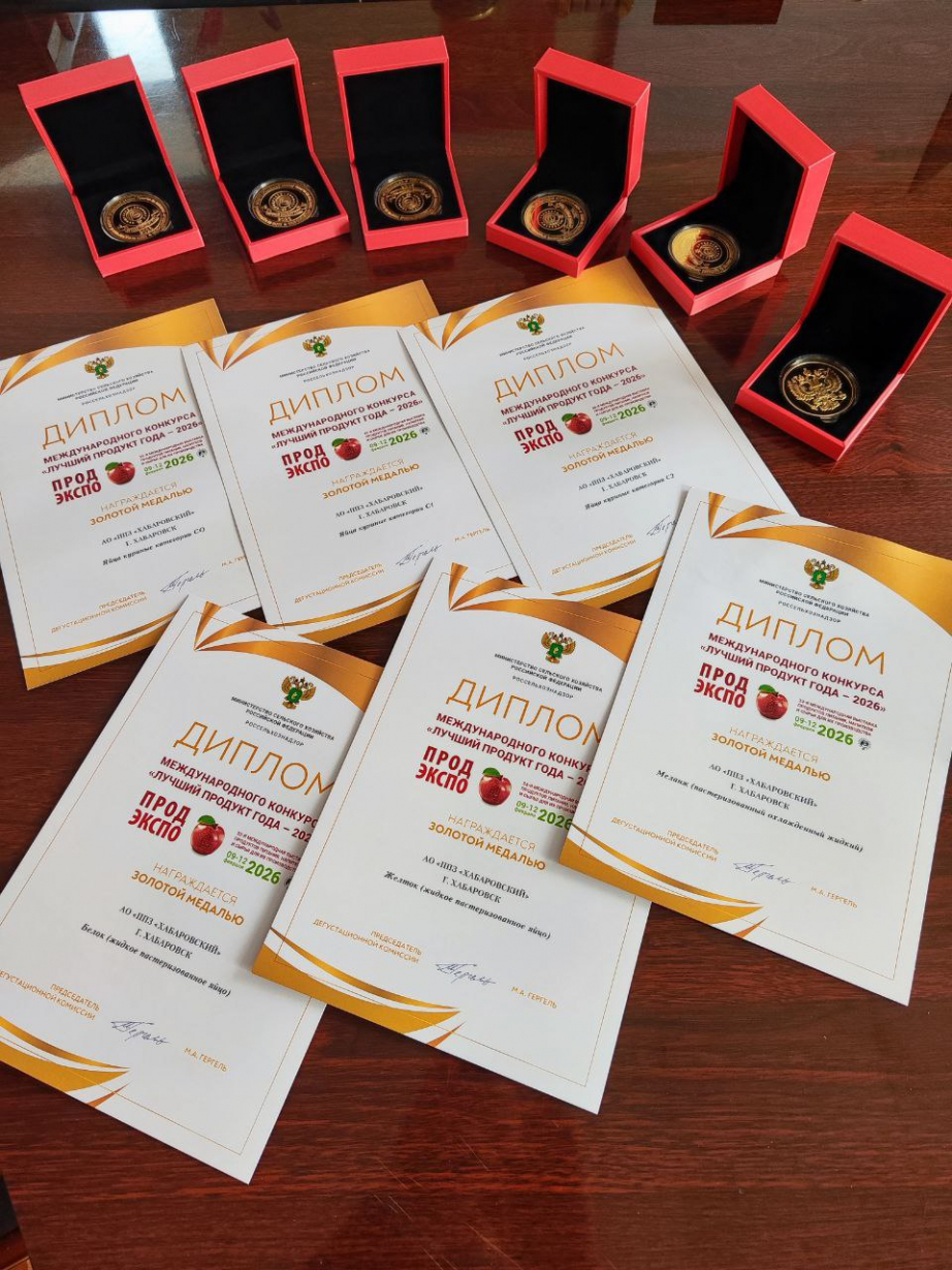 На 33-й Международной выставке «Продэкспо» в рамках конкурса «Лучший продукт года – 2026» производители куриного яйца из Хабаровского края удостоились 11 золотых медалей и дипломов.